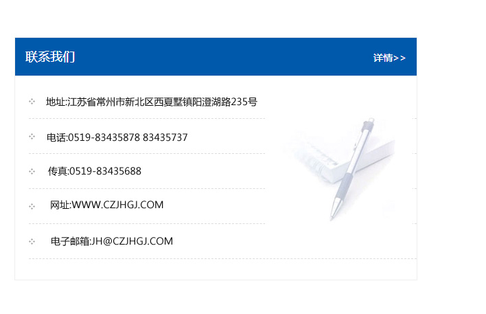 地址:常州市新北區友邦商務大廈1幢16、17層  電話:0519-85101652  傳真:0519-85112595  郵編:213022  網址:www.cz-jiayue_cn.dhhlxs.com  郵箱:xiajifengaa@163.com